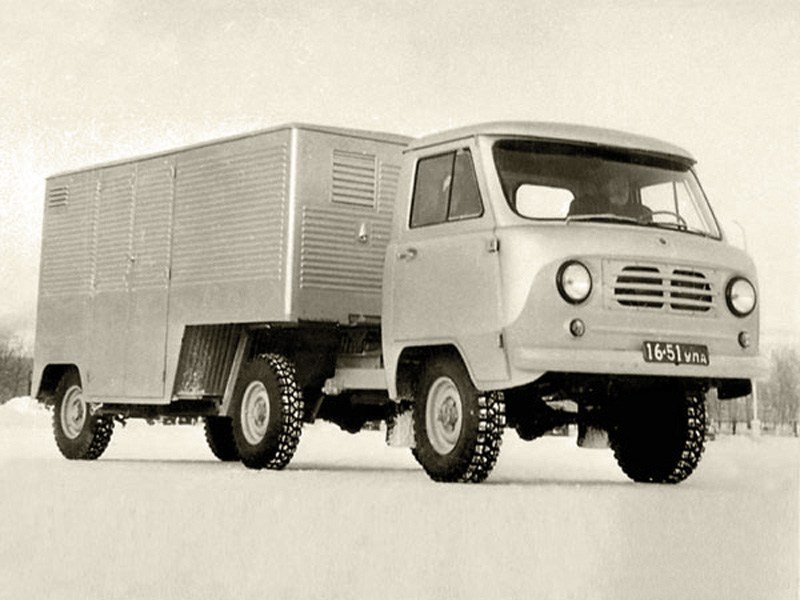 Знаменитый УАЗ-«Буханка» в советские времена был чем-то вроде нынешней ГАЗели. Инженеры старались выжать из конструкции все соки без остатка. Так родился сначала седельный тягач. Его выпустили в 1962-63 годах небольшой опытной партией. Прицепом к нему шел, как правило, изотермический фургон, разработанный все там же, на УАЗе. Развитие автомобиль получил уже в наше время на базе ГАЗели.