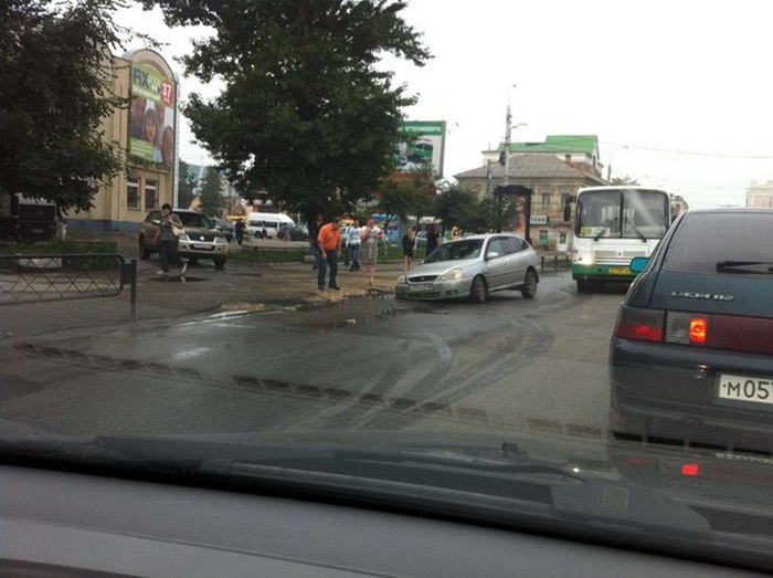 - Я ехала на работу в сторону центрального рынка, а когда уже подъезжала к этому перекрестку, то обратила внимание на необычную аварию, - говорит девушка. - Присмотревшись, я поняла, машина накренилась, потому что ее переднее правое колесо полностью ушло под асфальт. Я стояла и ждала, когда поток машин начнет двигаться, поэтому успела сфотографировать.
