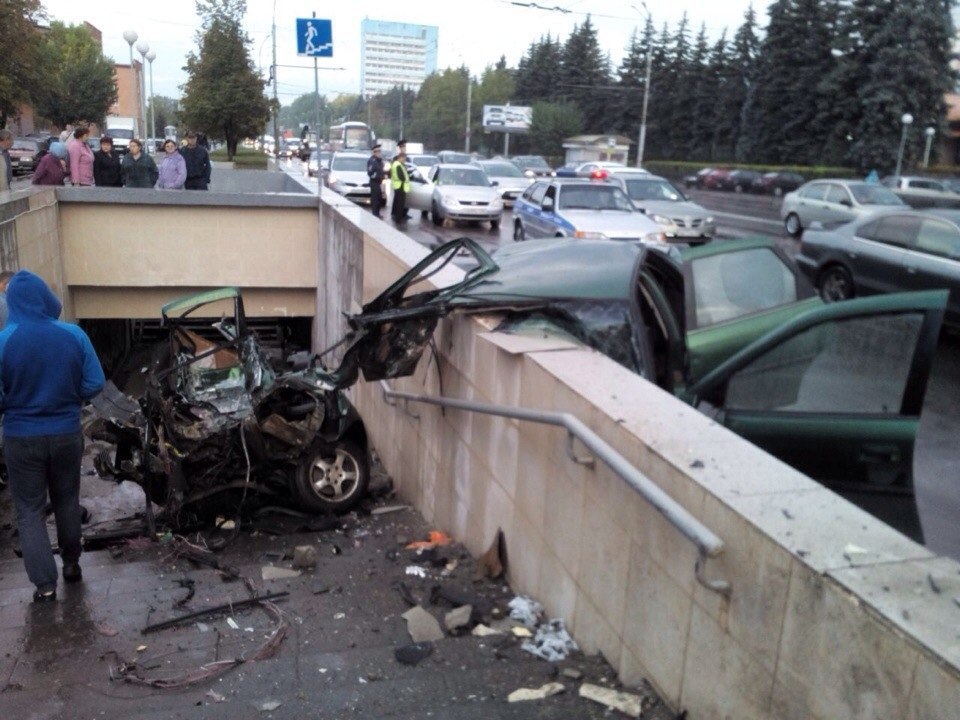 Появились первые фотографии с места ужасной аварии, произошедшей сегодня утром на проспекте Победы. На кадрах видно, что автомобиль буквально разорвало на две части, разметав осколки корпуса и стекол по подземному пешеходному переходу.