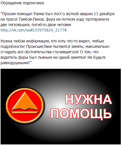 Сегодня, 22 декабря 2014 года, в группе "аварии Тамбова" появился в пост, в котором родственники просят откликнуться очевидцев аварии.