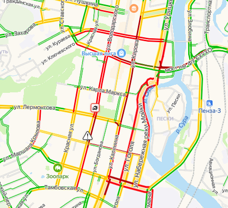 Автомобильные пробки возникают по всему городу. Судя по карте пробок, на множестве улиц, в том числе Кирова, Пушкина, Кураева и других автомобилисты испытывают проблемы с движением.
