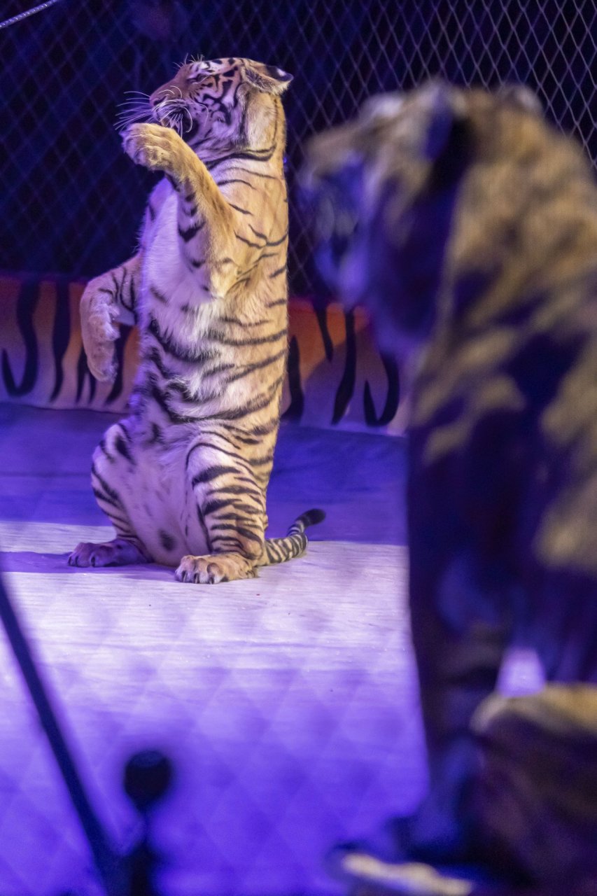 Красиво завершили выступление короли арены - дрессированные тигры. Животные показали зрителям необычные трюки, поражая своей красотой и уникальной дрессурой династии Запашных.