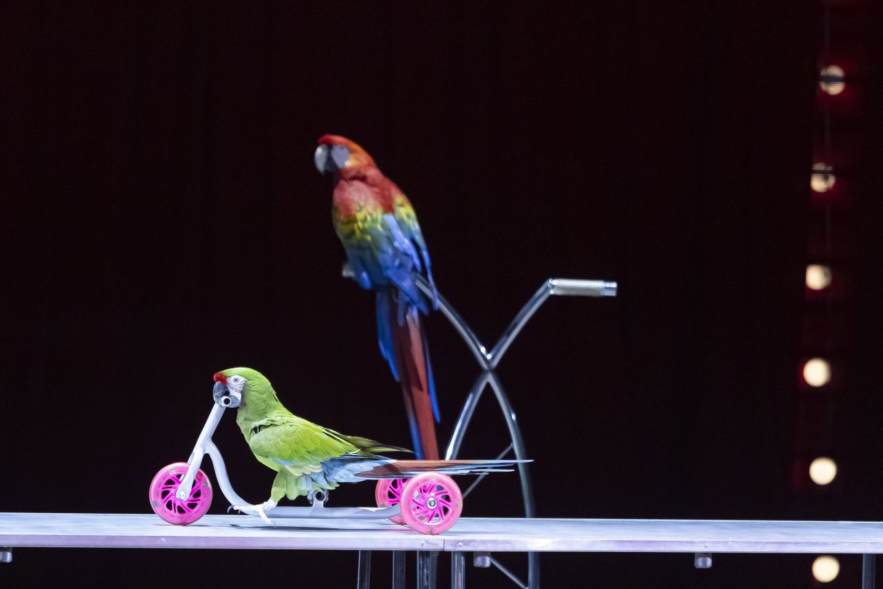 Умиление и радость на лицах зрителей вызвали дрессированные животные. Свои навыки продемонстрировали говорящие попугаи Ара. Яркие птицы показывали трюки со стаканами, катались на мини-велосипеде и летали по залу.