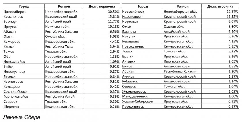 География вторичного жилья, ожидаемо, шире. На тройку лидеров приходится около трети – это Новосибирск (12,9%), Красноярск (11,3%) и Норильск (9,1%). Из городов, не являющихся административными центрами субъектов Федерации, чаще всего покупают готовые квартиры, кроме уже отмеченного Норильска, в Новокузнецке (3,9%) и Братске (3,2%).