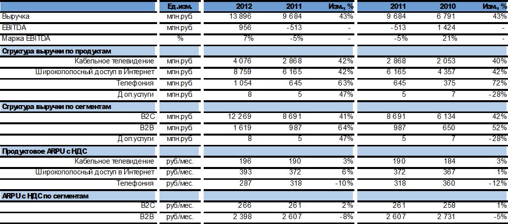 За 12 месяцев 2012 года выручка от услуги широкополосного доступа в Интернет составила 8 759 млн. руб. без НДС (63% в общей структуре выручки), от предоставления услуг кабельного телевидения – 4 076 млн. руб. без НДС (29% в структуре общей выручки), от предоставления услуги телефонии – 1 054 млн. руб. без НДС (8 % в структуре общей выручки).