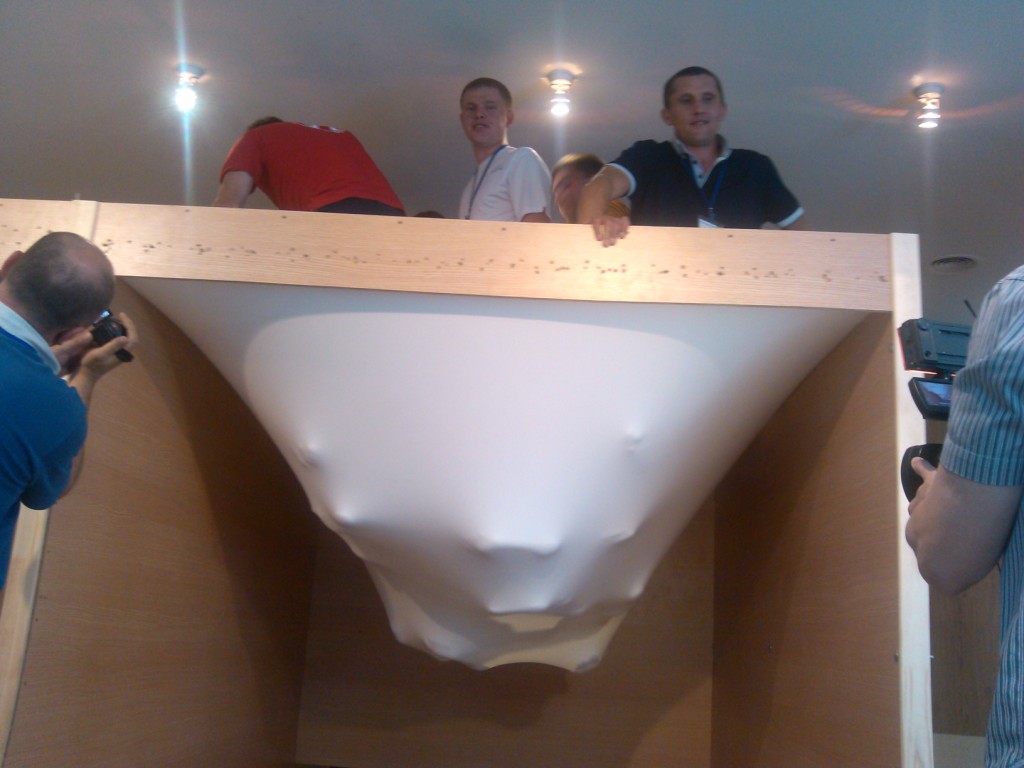 Монтаж конструкций натяжного потолка, по общему своему принципу, довольно прост. Так, сначала по периметру стен крепится багет. Потом воздух в комнате разогревается тепловой пушкой до определенной температуры, и полотно потолка разворачивается. Его крепят специальным инструментом сначала по углам, а потом к периметру стен. И все - потолок готов. Конечно же, здесь есть ряд своих хитростей, и установщикам необходимо немало опыта, чтобы быстро и грамотно выполнить свою работу.