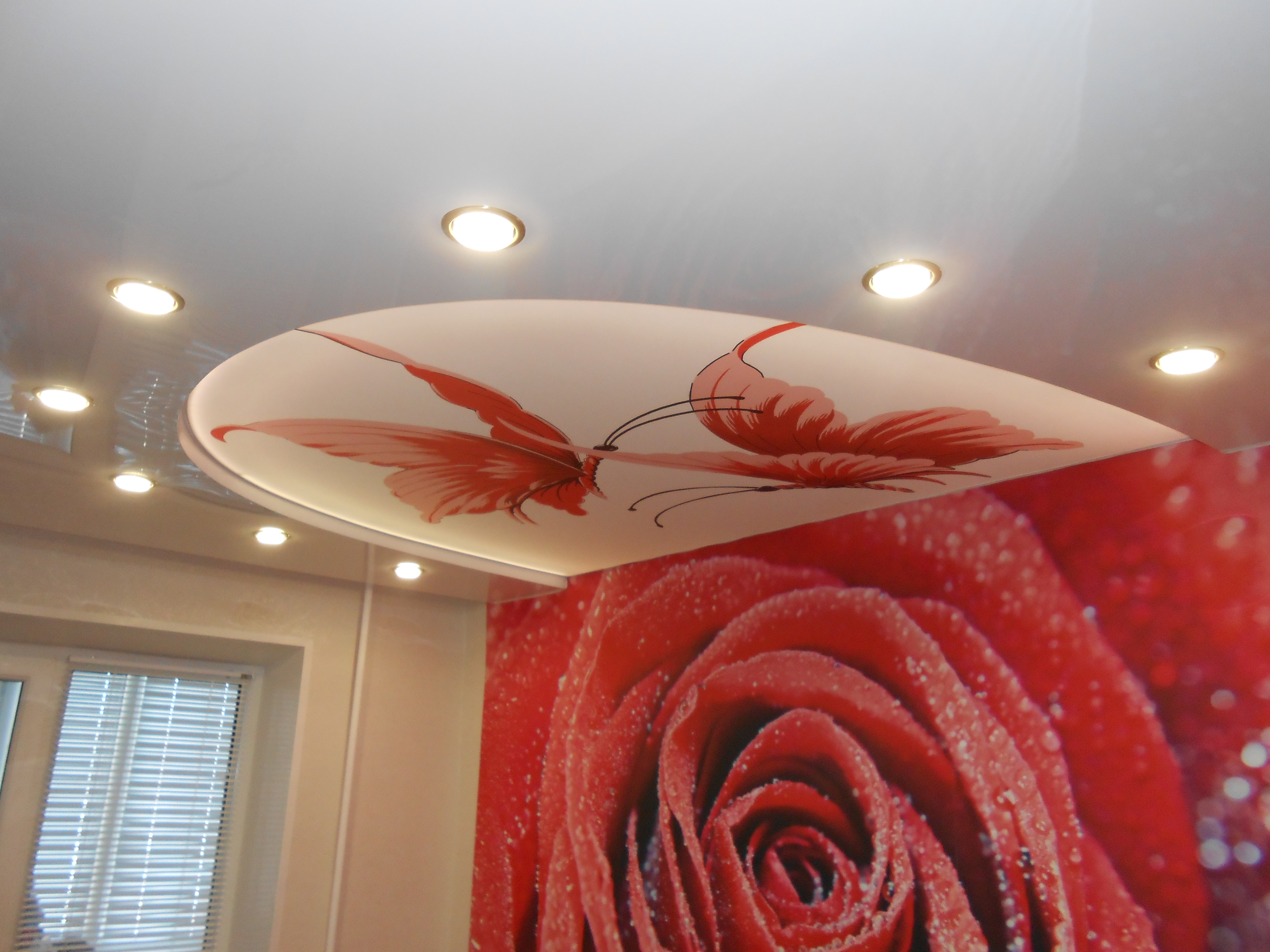 На натяжных потолках можно наносить различную фотопечать. Специальный принтер напечатает на полотне любое изображение, и после установки потолка над головой красуется выбранный вами рисунок. Помимо эстетической стороны, в этом решении есть и практический смысл: за счет правильно выбранного изображения можно визуально увеличить пространство в комнате.