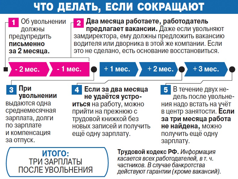 "Никто не может заставить вас заставить заявление на увольнение по собственному желанию. Об этом многие специалисты забывают. Также заблаговременно должен выйти приказ о сокращении. Сотрудники обязательно должны поставить роспись в этом документе. Об увольнении сотрудника работодатель обязан предупредить за 2 месяца. Также работникам полагается денежная компенсация. О ее величине и сроках выдачи лучше уточнить".