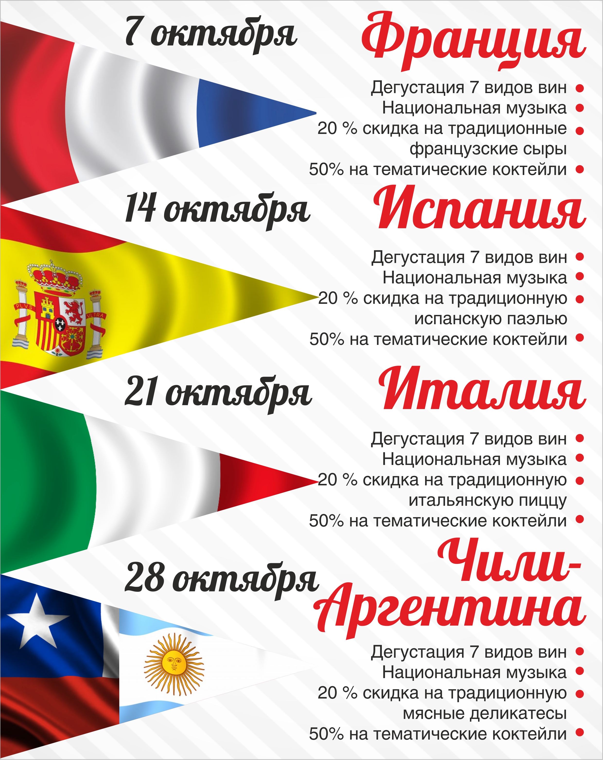 Каждую среду октября гостей ждут тематические вечера, посвященные винам определенной страны.