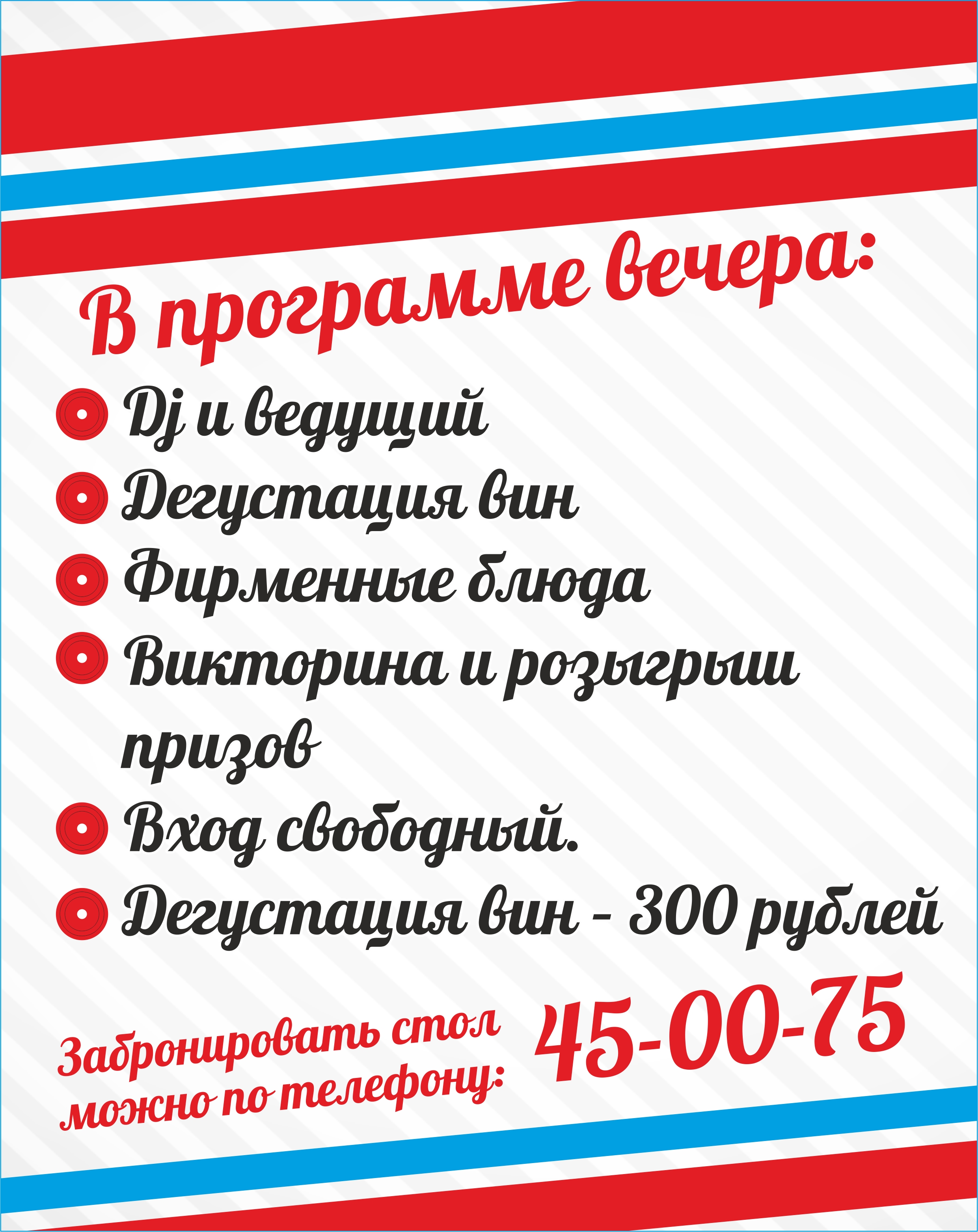 Вас ждет шоу-программа «Винный Вояж»: особенные по своей атмосфере легкие и беззаботные вечера с национальной музыкой, дегустацией вин и блюд, с приятными сюрпризами, призами и скидками на кухню и коктейли.