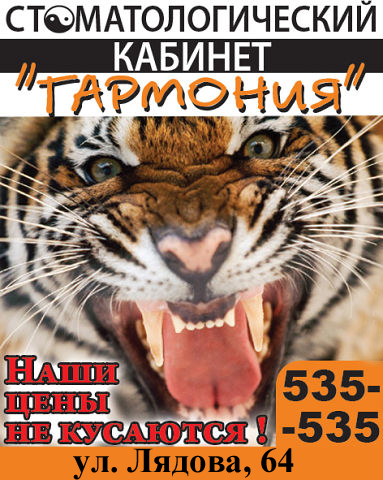 Стоматологическая клиника «Гармония» располагается по адресу : г. Пенза, ул. Лядова, 64. Записаться на прием можно по тел. 535-535 или 8 960 320 6002.
