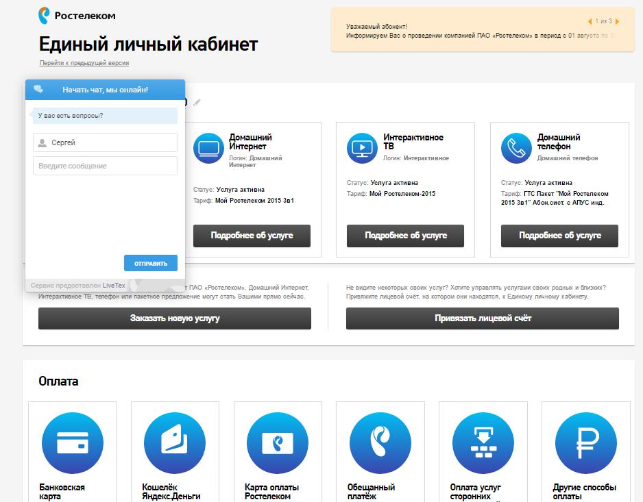 Единый личный кабинет и его мобильная версия – это персональный онлайн-офис «Ростелекома», который работает круглосуточно и помогает клиенту решать максимум задач по всем домашним услугам связи (телефон, интернет, телевидение): оплачивать и управлять услугами, подключать тарифы и опции и так далее.