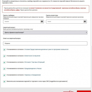 - Указать желаемый пароль к торговому счету, необходимый для входа в торговый терминал и пароль инвестора. Выбрать вариант секретного вопроса, и указать ответ на него. Согласиться со всеми документами, предлагаемыми брокером к ознакомлению и нажать кнопку «Открыть счет».