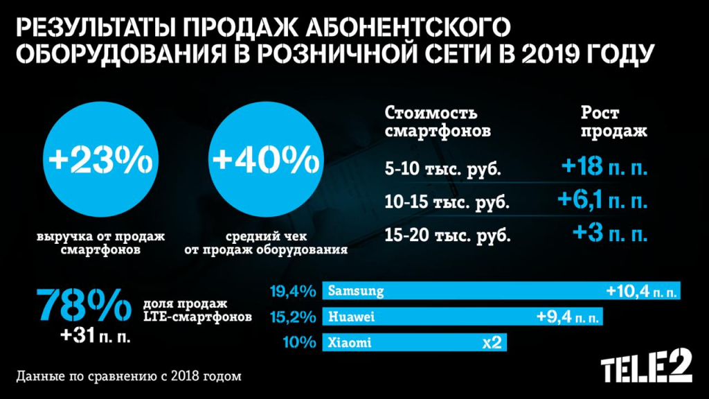 Выручка от продаж смартфонов в салонах Tele2 выросла на 23% по итогам 2019 года. Самыми продаваемыми устройствами в салонах связи Tele2 остаются гаджеты Samsung, Huawei, Xiaomi. Средний чек от продаж оборудования в розничной сети Tele2 увеличился на 40%, что обусловлено выбором покупателей в пользу более мощных устройств.