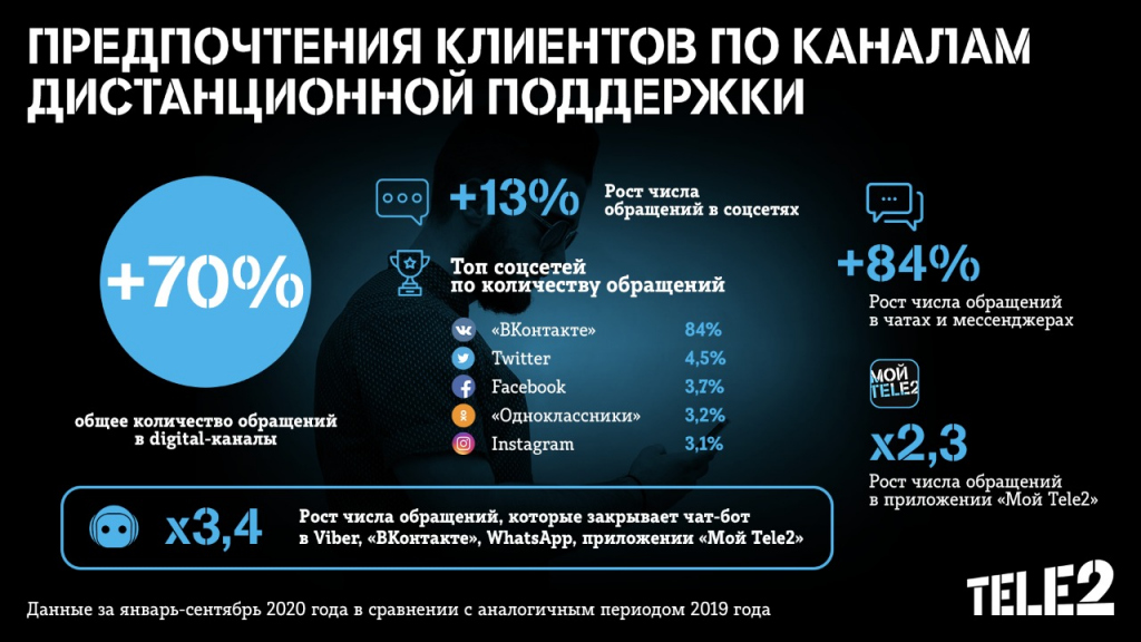 Чаще всего абоненты обращаются с вопросами в приложении «Мой Tele2», в социальной сети «ВКонтакте», а также активно используют чат-бот. Общее количество обращений в digital-каналах увеличилось на 70%.