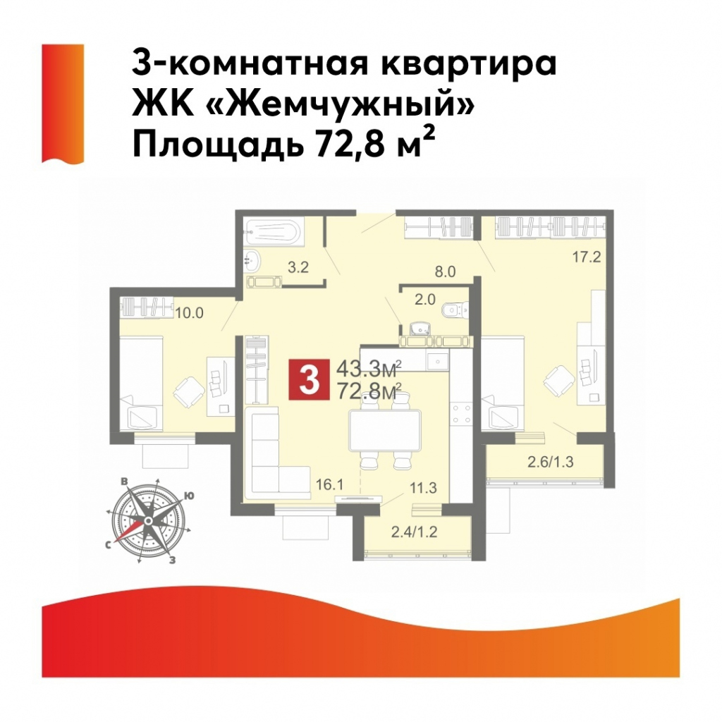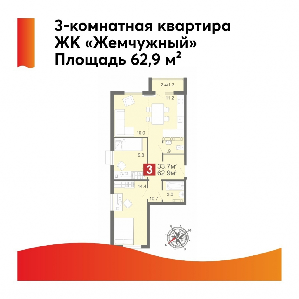 Планировки. Они разработаны для сценария жизни семьи с детьми. Так, сейчас в жилом комплексе «Жемчужный» в продаже два вида 3-комнатных квартир: площадью 63 и 73 кв. м.