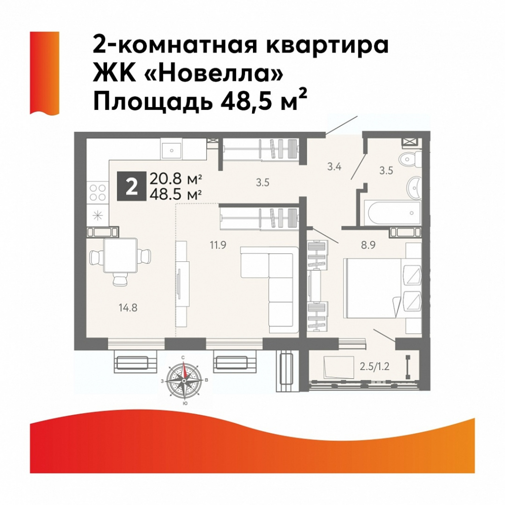 Разберем вариант с ипотекой от ООО «Агентство ипотечного кредитования»*. Объект – двухкомнатная квартира площадью 48,5 кв. м.