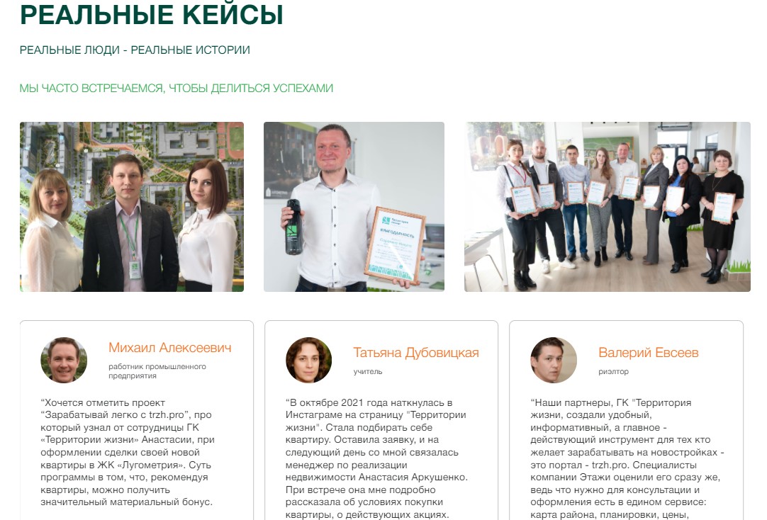 4. На сайте уже представлены кейсы и отзывы реальных участников проекта. Количество участников растет с каждым днем и на данный момент составляет 578 человек. С момента старта программы группа компаний «Территория жизни» выплатила всем активным участникам в общей сумме 4 664 944 рублей!