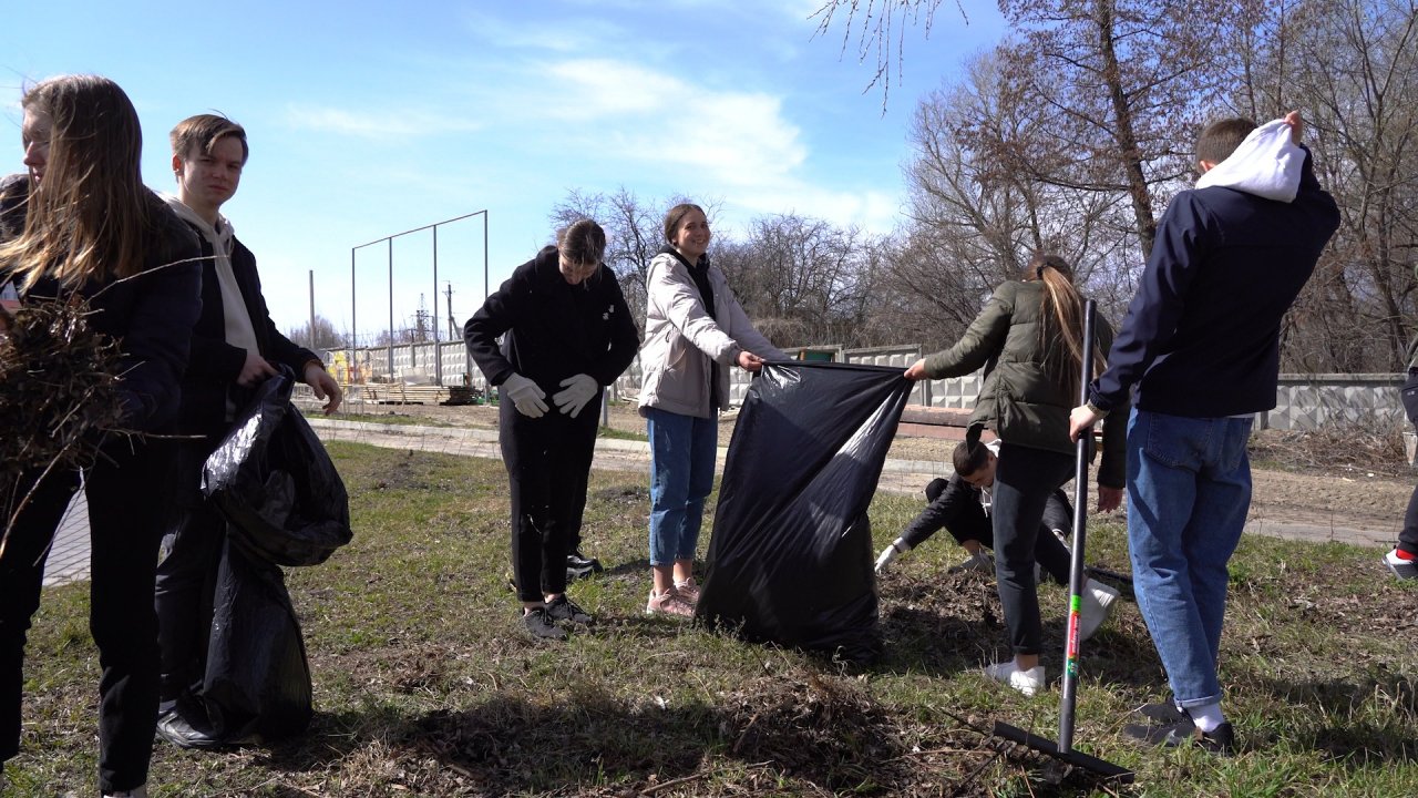 Учащиеся нескольких классов школы имени М. Ю. Лермонтова помогли убрать прошлогоднюю листву в парке и на набережной, а также подмели территорию мемориального комплекса «Колокол памяти», построенного «Термодомом» к 75-летию Великой Победы.