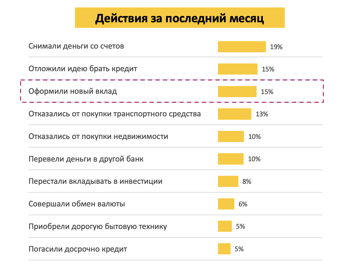 Тем не менее, 19% опрошенных снимали деньги со счетов, 15% отложили идею взять кредит и 15% открыли новый вклад.
