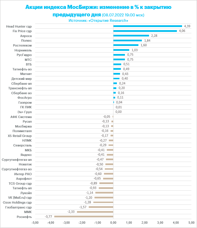 · В целом тон документа говорит о том, что FOMC ждет, скорее, мягкого приземления экономики США, нежели рецессионного сценария. В последующие дни выступили несколько представителей ФРС, которые высказались в пользу повышения ставки на заседании 27 июля еще на 0,75%, и такой же сценарий учитывают в ценах фьючерсы на FFR. Теперь, когда позиция ФРС на ближайшее будущее прояснилась, новым драйвером для рынка акций США может стать сезон корпоративной отчетности за II кв., который стартует в ближайшую пару недель (Alcoa отчитывается 20 июля).