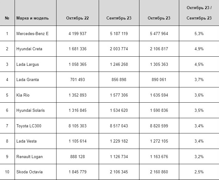 Эксперты «Открытие Авто» (блок автобизнеса банка «Открытие», входит в группу ВТБ) на основе данных компании Автохаб проанализировали динамику цен на наиболее востребованные машины с пробегом в октябре 2023 года. Оценка традиционно проводилась на рынке Москвы и Подмосковья, самом крупном регионе сегмента подержанных автомобилей России. Половина из топ-20 популярных машин во втором месяце осени возобновили процесс подорожания. Лидером по росту цены стал седан Mercedes-Benz E-класса (5,5 миллиона руб., +5,3% к сентябрю). Больше, чем на 3% подорожали популярные «корейцы», Toyota LC300 и три модели Lada – Largus, Granta и Vesta. В то же время колебания цен у 10 моделей оказались достаточно незначительными – ограничились диапазоном плюс-минус 2%.
