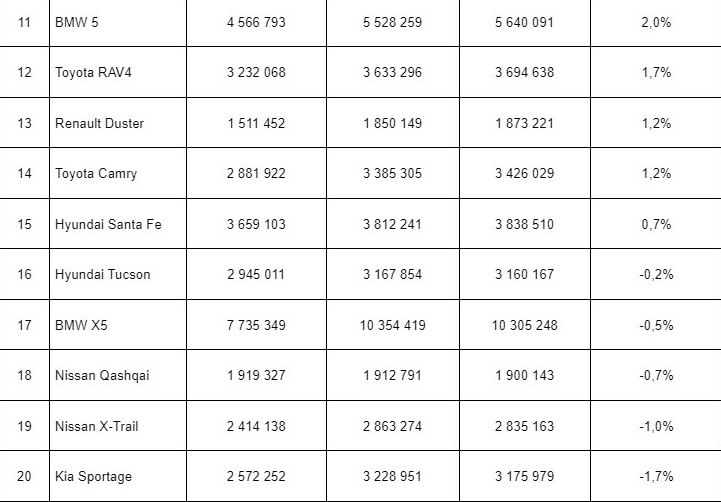 В то же время колебания цен у десяти моделей из топ-20 оказались достаточно незначительными, ограничившись диапазоном в плюс-минус 2%. В число этих машин вошли две BMW (седан 5-серии и кроссовер X5), две Toyota (паркетник RAV-4 и седан Camry), по паре Hyundai (Santa Fe, Tucson) и Nissan (Qashqai, X-Trail), а также Renault Duster и Kia Sportage.