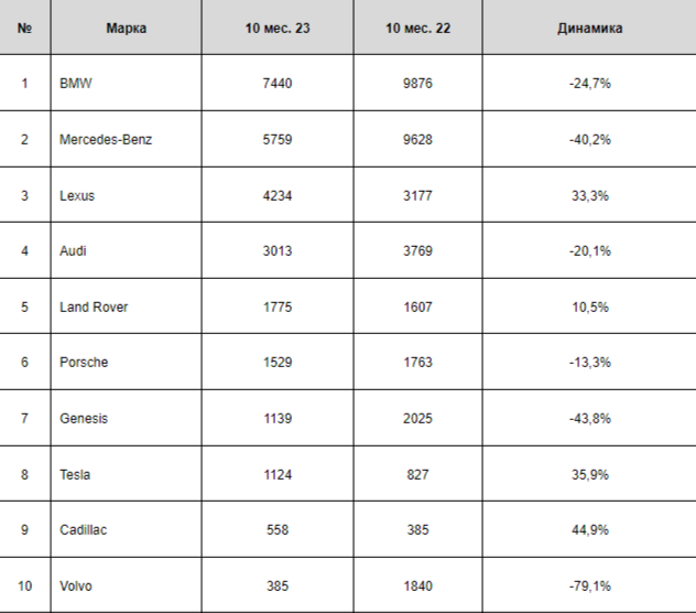 Lexus, напротив, на фоне прошлогодних провалов сейчас выглядит вполне радужно. В нашей стране раскупили 4,2 тысячи этих автомобилей, на треть больше, чем за 10 месяцев в 2022 году. Этого оказалось достаточно, чтобы прочно закрепиться в тройке самых востребованных марок сегмента. Как и в былые годы, большую долю продаж обеспечивает очень любимый женщинами за комфорт и красоту вседорожник – Lexus RX. Такими же темпами роста отметилась и Tesla (1,1 тысячи, +36%). Bentley покупали в 1,5 раза чаще, Acura и Aurus – почти в два, Lincoln – в три. Среди нарастивших продажи по итогам периода марок нужно отметить также Land Rover (+11%) и Cadillac (+45%). В то же время не сумели прибавить в продажах Volvo, Infiniti, Mini, Jaguar, Rolls Royce и Maserati.