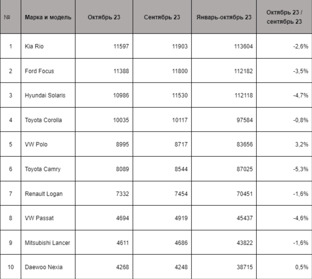 Эксперты «Открытие Авто» (блок автобизнеса в банке «Открытие», входит в группу ВТБ) проанализировали результаты продаж октября и 10 месяцев 2023 года на рынке легковых автомобилей с пробегом. Второй месяц подряд количество сделок продолжало падать: было зафиксировано 579,2 тысячи перерегистраций. Это на 3% меньше, чем в сентябре и на 11% – по сравнению с рекордным августом. В топ-20 популярных брендов не нашлось ни одного, который бы так или иначе не сократил продажи. Суммарно общий объем продаж подержанных легковых автомобилей в текущем году составил 5,58 миллионов «штук» (+26%), а по итогам года может составить порядка 6,8-6,9 миллиона авто.