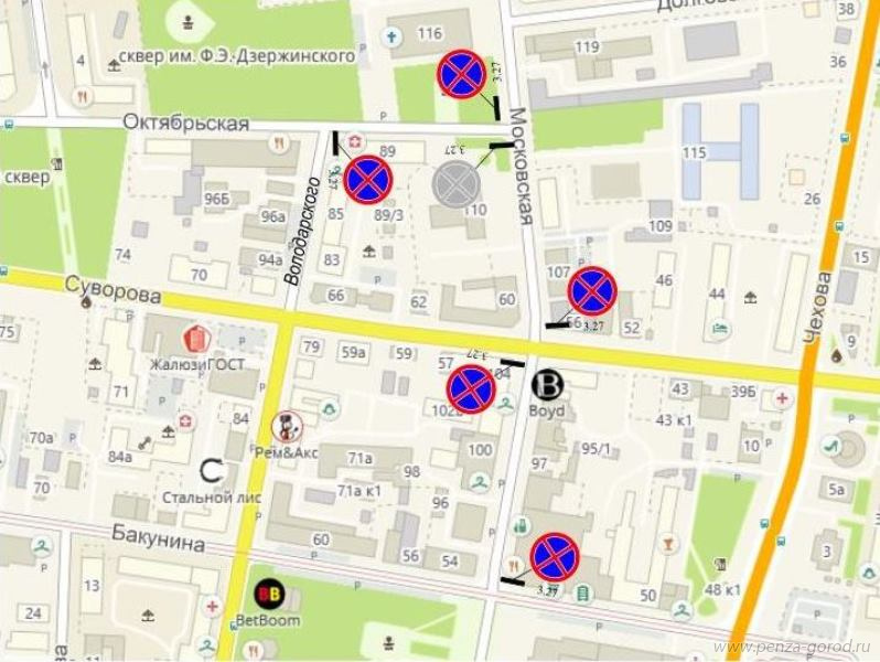 - по улице Московской от улицы Октябрьской до улицы Бакунина (по четной и нечетной сторонам).