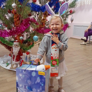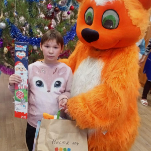 Магазин «Галамарт» и «Магазин постоянных распродаж» подарили «ватрушку» для катания по снегу, скейтборд, канцелярские принадлежности, наклейки, раскраски и другие нужные вещи. Мальчикам подарили игрушечные машинки. А Лиза Грачева получила в подарок большого плюшевого гуся-обнимашку.