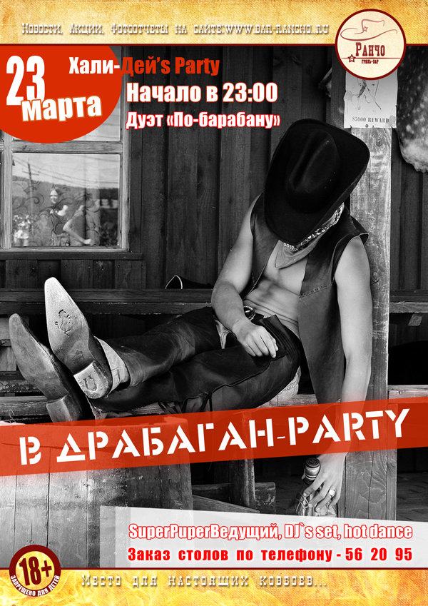 23 марта в гриль-баре «Ранчо» «В драбаган» Party. Этим вечером вас ожидает зажигательное шоу там-тамов от дуэта «По барабану», крейзи-программа от ведущего и горячие танцы на барной стойке! Начало в 23.00.
