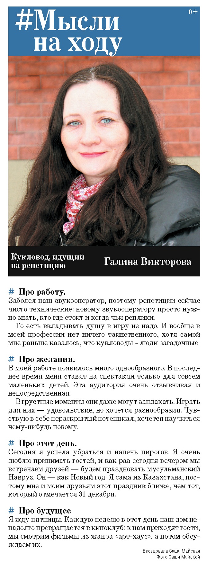 На этой неделе в рубрике «Мысли на ходу» приняла участие кукловод Галина Викторова. Вот что она о себе рассказала.