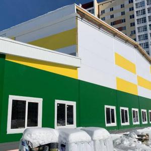 Планируется завершить строительство к июню. В настоящее время строители занимаются монтажом внутренних коммуникаций, таких как системы отопления, электро- и водоснабжения. Следующим этапом будет отделка, благоустройство и завершение покрытия футбольного поля.