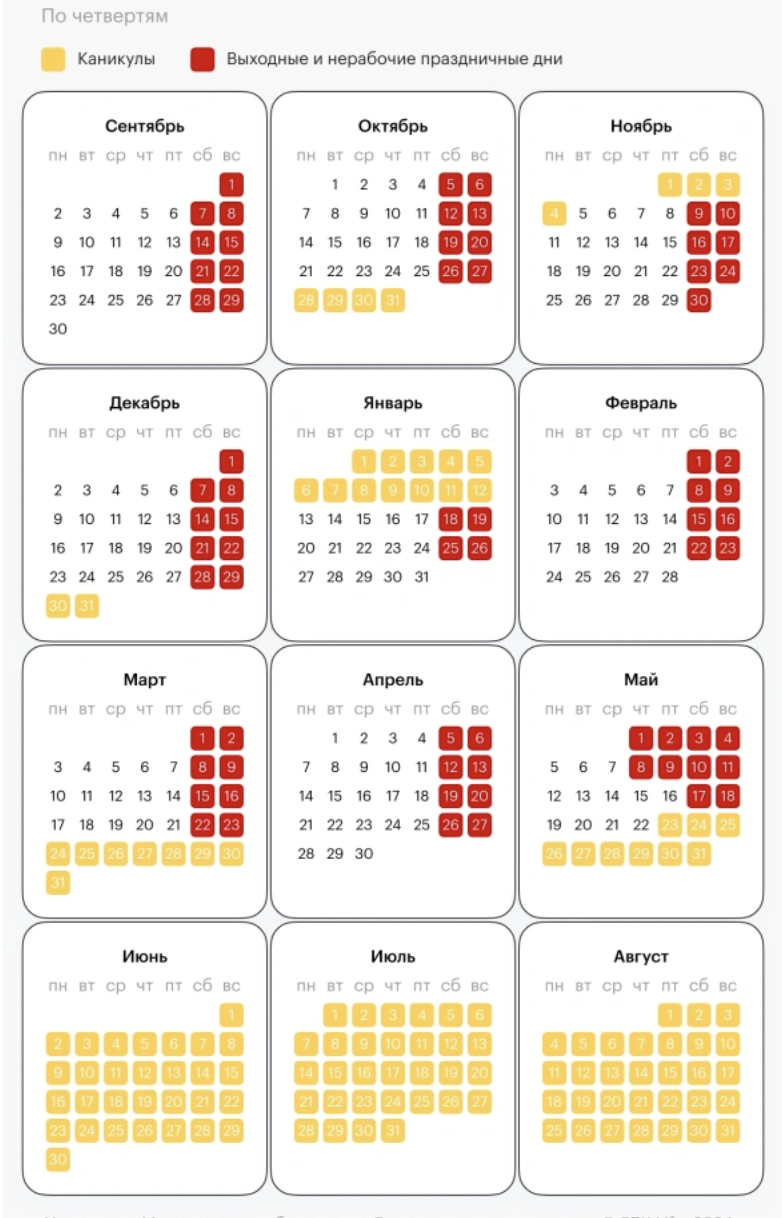 Медиагруппа «РБК» опубликовала календарь календарь каникул по четвертной системе: