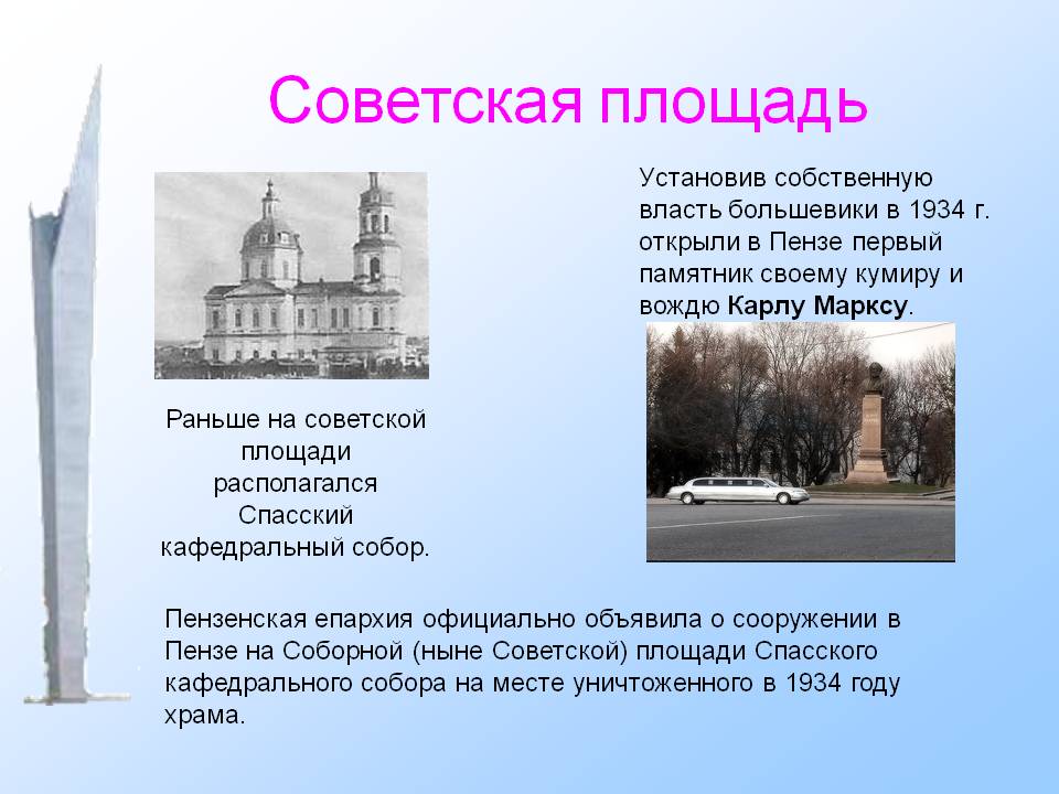 Многолетняя история площади хранит немало знаменательных событий. Здесь проходили отряды бунтарей Степана Разина и Емельяна Пугачева, отсюда отправлялись пензенские ополченцы на Отечественную войну 1812 года. Содрогалась площадь и от суровых раскатов Гражданской войны, и от бурных оваций первомайских и ноябрьских демонстраций…