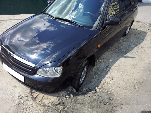 Вчера, примерно в 13:00 около стройки на улице Плеханова Татьяна Павлова выезжала со стоянки на дорогу. Внезапно машина накренилась и встала. Выяснилось, что Priora Татьяны попала передним левым колесом в образовавшуюся около канализационного люка яму. При чем яма оказалась настолько глубокой, что провалившееся колесо висело в воздухе и при попытке тронуться с места беспомощно буксовало.
