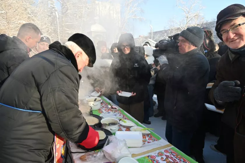 Завершилось все торжество народными гуляниями, творческими номерами. И, конечно же, не обошлось без угощений. Александр Гуляков сам пек блины. Кроме того, гостей ждал плов, медовуха и другие яства.