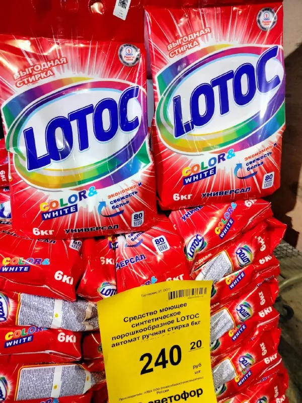 А вот еще один герой полок — стиральный порошок LOTOC. Шестикилограммовая упаковка, цена — всего 240 рублей. Производитель из Новосибирска обещает аж 80 стирок. Верится с трудом, но математика простая: пачка большая, значит, и стирок много. По характеристикам — полный аналог Safir: универсальный, для автоматической и ручной стирки, для белого и цветного.