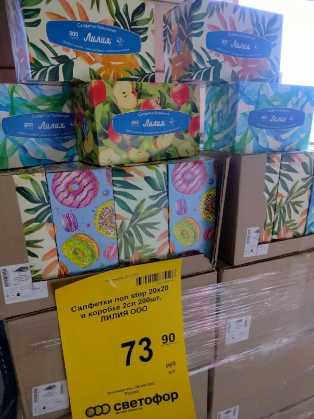 Но «Светофор» — это не только порошки-гиганты. Там есть место и для приятных, даже эстетичных мелочей. Например, бумажные салфетки «Лилия». Продаются они в ярких картонных коробках, которые и прятать в шкаф не хочется — так и просятся на стол или на полку. Цена — около 74 рублей за коробку. Внутри 200 листов, два слоя, размер 20х20.