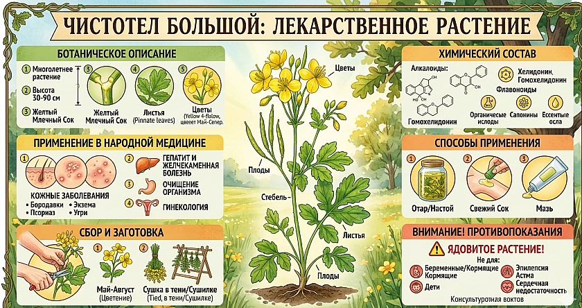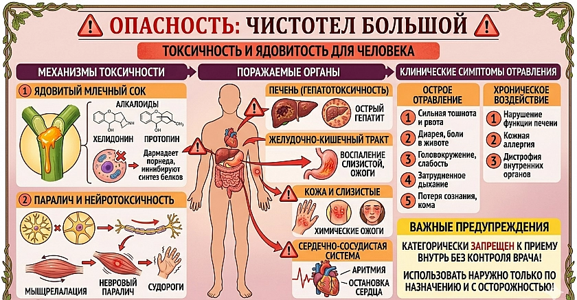 «Трава чистотела обладает преимущественно местным противовоспалительным действием и для приёма внутрь не рекомендуется. Отравление возникает при употреблении концентрированного раствора или большого количества препарата. Чаще всего протекает с болями в животе, тошнотой, рвотой, жалобами со стороны сердца».