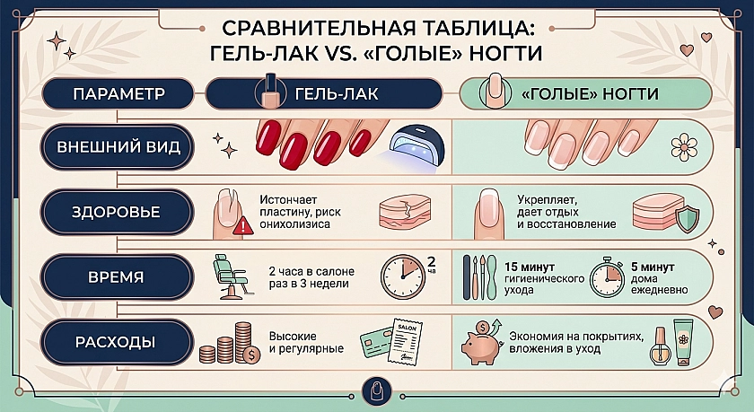 Переход на «голые» ногти — это не просто следование тренду, это выбор в пользу здоровья и естественной красоты. Попробуйте сделать паузу, и вы, возможно, как и я, с удивлением обнаружите, что ваши собственные ногти без декоративного слоя выглядят гораздо элегантнее и современнее любого, даже самого модного дизайна.