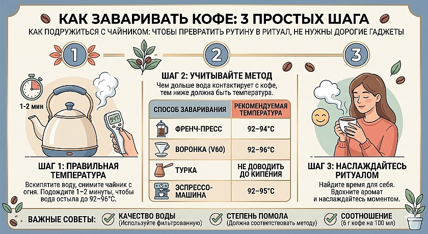 Дайте чайнику остыть. Снимите его с огня и подождите 1–2 минуты. Этого достаточно, чтобы вода опустилась в заветный диапазон 92–96°C.