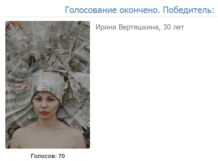 С 15 по 20 февраля на сайте проходило голосование. Посетители портала выбрали победителя конкурса. Им стала Ирина Вертяшкина. За девушку проголосовали 70 человек.