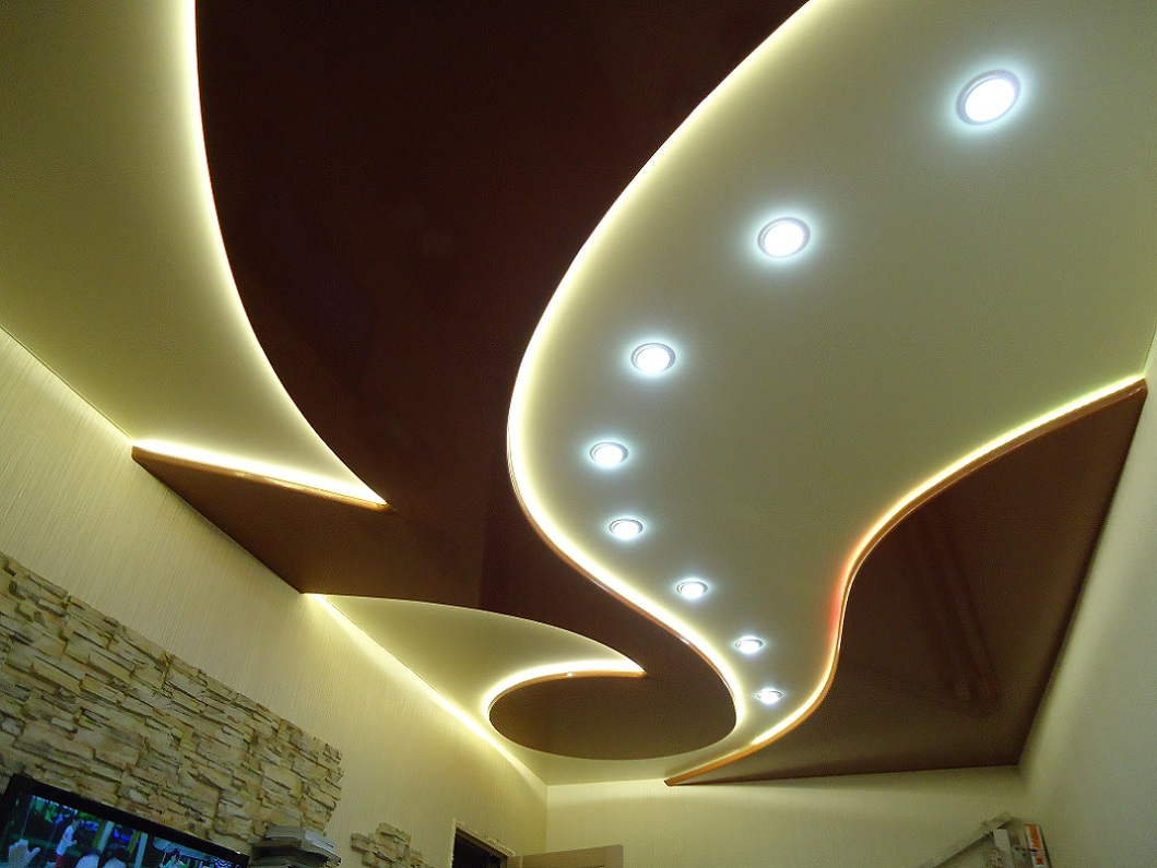 6. При установке натяжного потолка можно как угодно расположить светильники. Сделать основное освещение, точечное и даже подсветку. А если вы выберете полотна из транслюцентной пленки (полупрозрачной), то сможете создавать различные светящиеся поверхности.