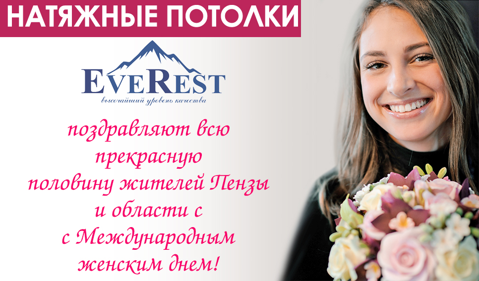 Компания EveRest поздравляет всю прекрасную половину жителей Пензы и Пензенской области с наступающим 8 Марта и при заказе натяжных потолков всем девушкам дарит в подарок 10-процентную скидку на ВСЕ услуги по установке. Плюс специальное моющее средство для натяжных потолков, которое обязательно пригодится всем хозяйкам. Акция действует с 1 по 16 марта включительно.