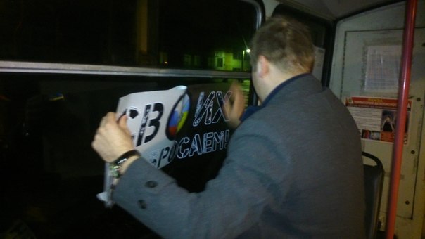 16 марта активисты "Молодой гвардии" провели акцию в поддержку русскоязычных граждан в Крыму. Рано утром они отправились в автобусный парк и троллейбусное депо, чтобы расклеить в общественном транспорте наклейки с надписью «Своих не бросаем» и изображением флагов России и Украины.