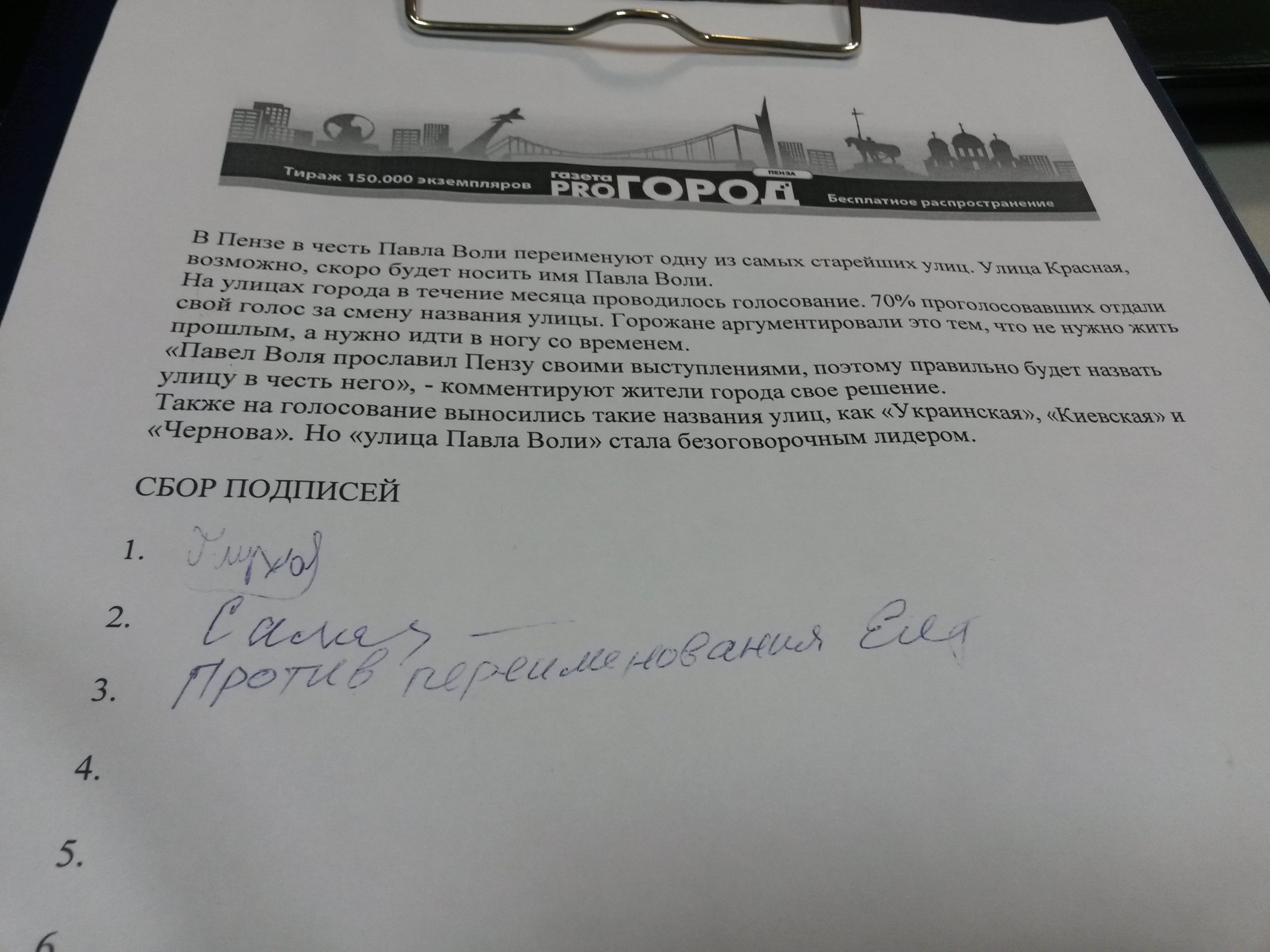 1 апреля в Пензе собирали подписи против переименования улицы в честь Павла Воли (ВИДЕО)