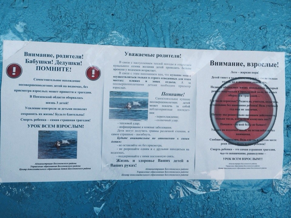 Также, в Бессоновском районе недавно были развешаны объявления о необходимости несовершеннолетним соблюдать осторожность, когда они находятся на водоемах без взрослых. Распоряжение о расклейке объявлений поступило от администрации и Управления образования района.
