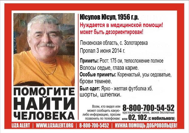 Поисковый отряд «Лиза Алерт» разыскивает очередного пропавшего человека. На этот раз 58-летний мужчина по имени Юсуп Юсупов исчез в селе Золотаревка. Сообщается, что последний раз его видели 3 июня. После этого вестей о мужчине нет.